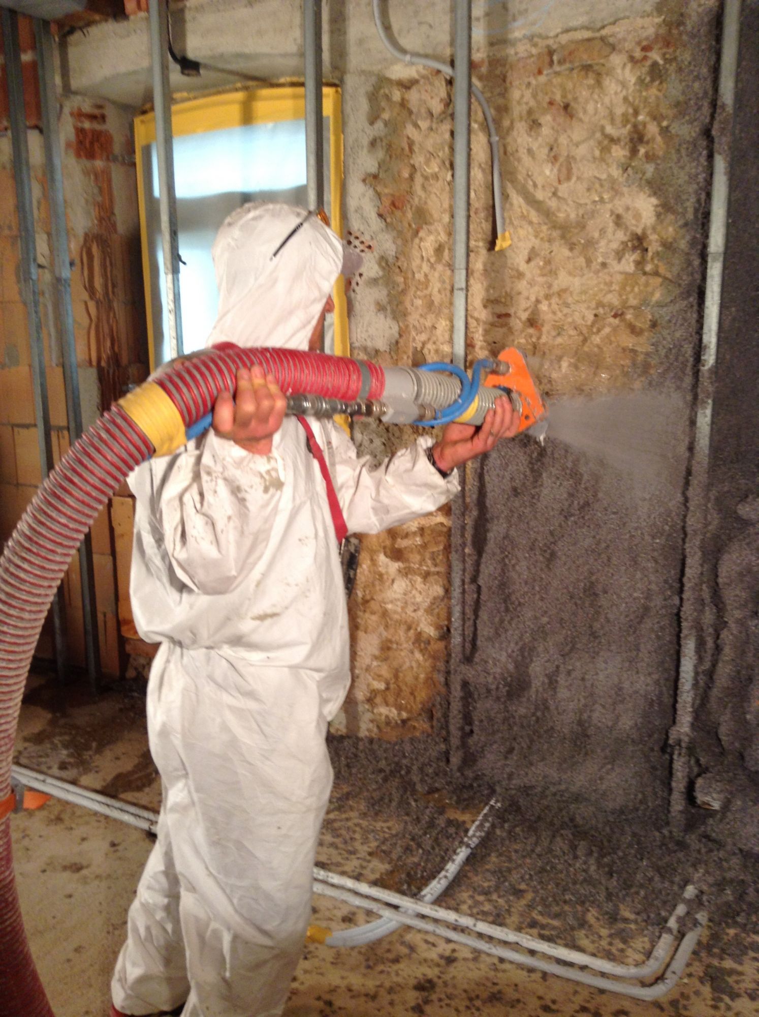 Die Cellulosedämmung wird direkt auf die Innenwand-Oberfläche aufgesprüht. Bei der Verarbeitung wird den Cellulosefasern ein geringer Kleberanteil über den separat am Sprühschlauch aufgesetzten Cellfloc Cobra Sprühkopf beigemischt. Die Schichtstärke der Cellulose bei der Verarbeitung bewegt sich im Regelfall zwischen 5 und 12 cm. Wandunebenheiten lassen sich bei der Verarbeitung gleich mit ausgleichen. Nach vollständiger Austrocknung wird die Cellulose direkt mit bauhygienischen Kalk- oder Lehmputzen verputzt.