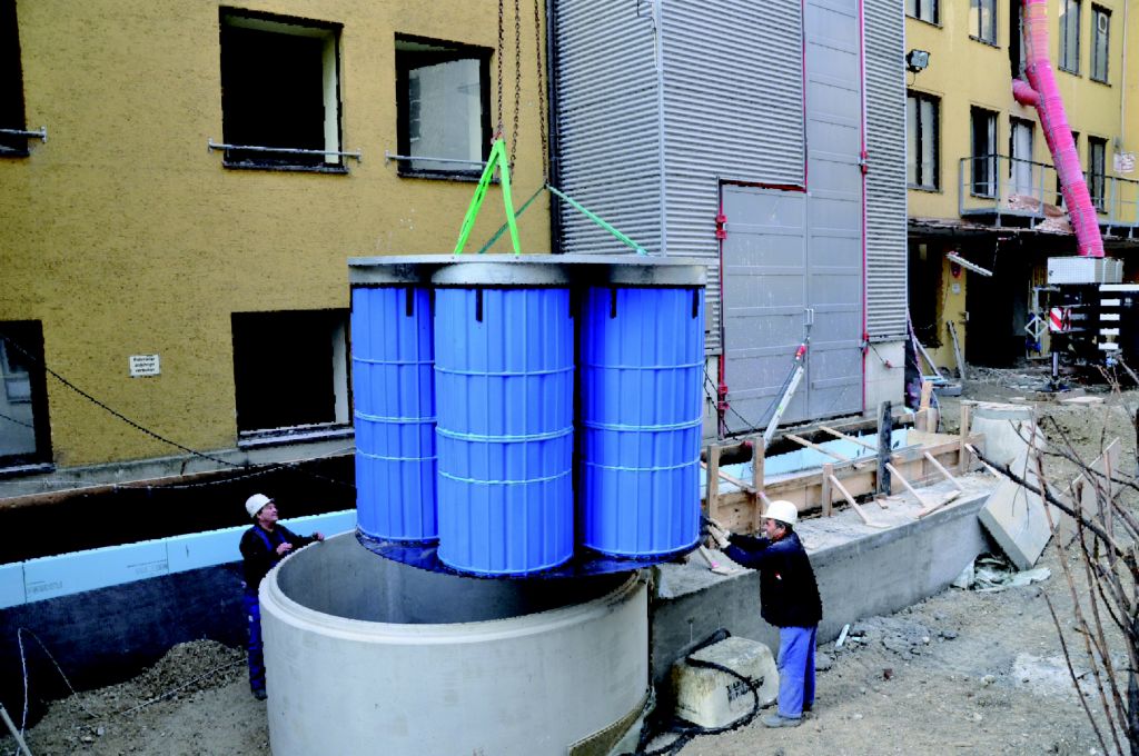 Die Innenstadtlage des Deutschen Theaters mit engen Straßen führte zu außergewöhnlichen Problemstellungen. So war z.B. der Einbau einer Rigole zur Versickerung nicht möglich, das Wasser sollte daher in einen bereits bestehenden Sickerschacht eingeleitet werden. Vorgesehen waren ursprünglich fünf Einzelschächte, die aber wegen des beengten Straßenraums nicht zu realisieren waren. Die fünf Filterschächte des 3P Hydrosystems 1000 metal wurden deshalb in einem einzigen großen Betonschacht mit drei Metern Durchmesser anschlussfertig eingebaut. Eine weitere Schwierigkeit stellte der stark kieshaltige Untergrund dar, der das Ausheben einer Baugrube unmöglich machte. Mit dem Büro Zickler+Jakob, München, wurde daher ein so genannter Abteufschacht als Lösung entwickelt. Der Betonring wurde an der Unterseite mit einer Metallschneide versehen, auf dem Gelände aufgesetzt und von innen ausgebaggert. Dadurch rutschte er nach und nach auch ohne Baugrube auf die gewünschte Tiefe ab. Nachdem sie erreicht war, wurde der Boden ausbetoniert. Mit Hilfe eines Autokrans wurde in München zuerst der Betonschacht eingebracht, nach Fertigstellung des Bodens und der Kernbohrungen für Zu- und Ablauf folgte die komplette Filtereinheit mit Arbeitspodest.