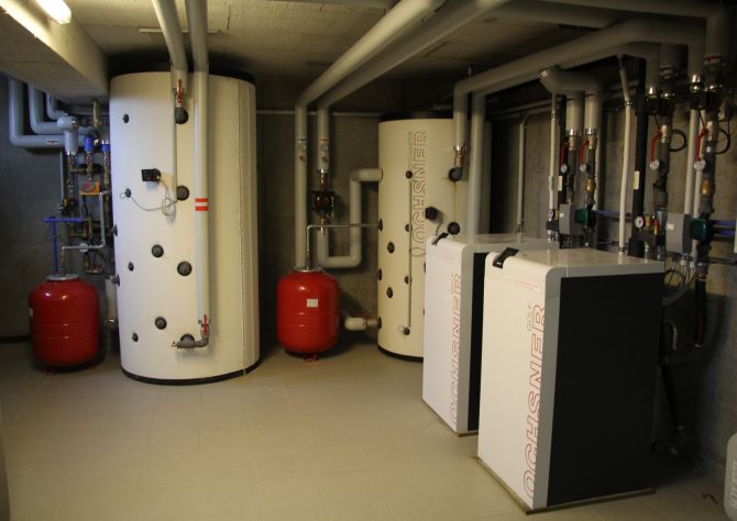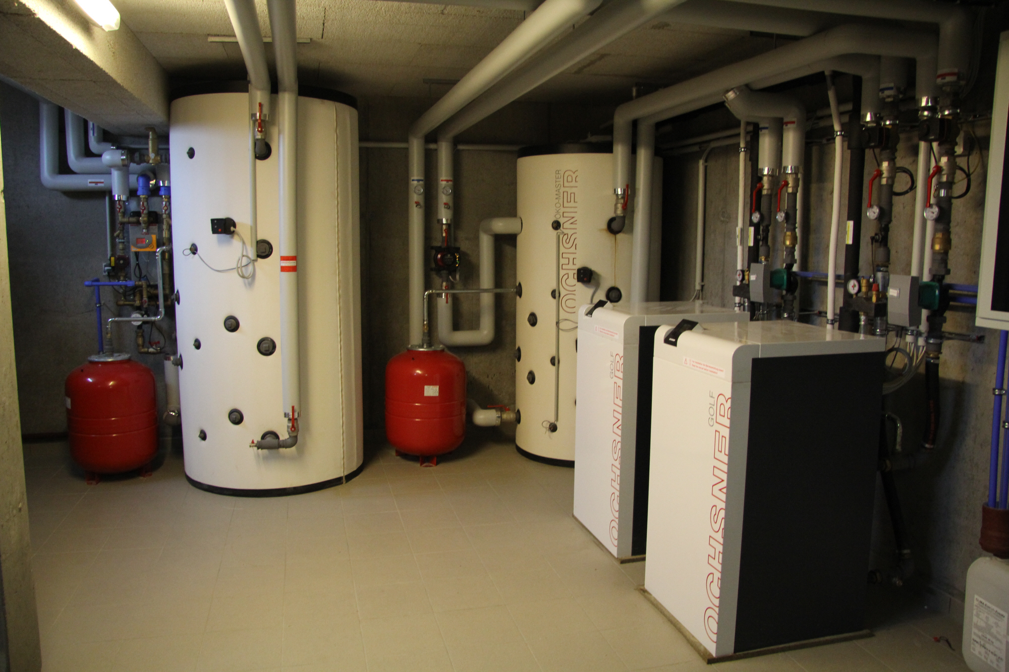 Durch die ausführende Installationsfirma, den Ochsner Systempartner RORA Installationen GmbH, wurden die Wärmepumpen in zwei Kaskaden à zwei sowie einer Kaskade à drei Wärmepumpen geschaltet. So ist eine flexible Anpassung der Leistung an den aktuellen Bedarf durch Zu- oder Abschaltung von Wärmepumpen innerhalb der Kaskade möglich. Zur Wärmespeicherung für Heizung und Warmwasser kommen pro Kaskade je ein Ochsner PU2000 und ein Ochsner PU2000 mit hygienischer Warmwasserbereitung zum Einsatz. Die Speicher haben ein Fassungsvermögen von je 2.000 Litern und besitzen eine hocheffiziente Polyurethan-Hartschaum-Isolierung. Da die eingesetzten Wärmepumpen serienmäßig Vorlauftemperaturen bis zu 65°C im reinen Wärmepumpenbetrieb erreichen können, ist der Legionellenschutz im Trinkwasserbereich sichergestellt.