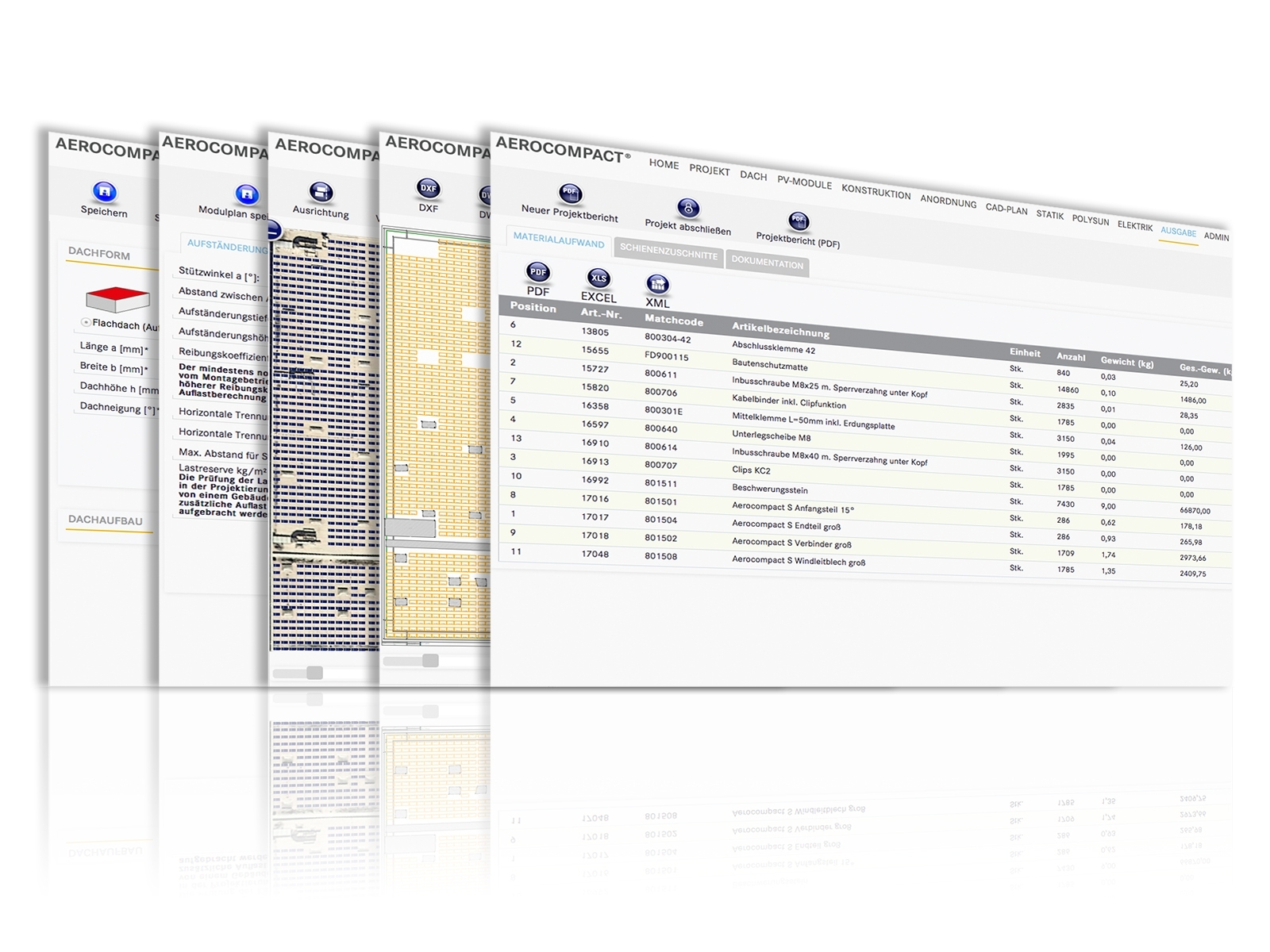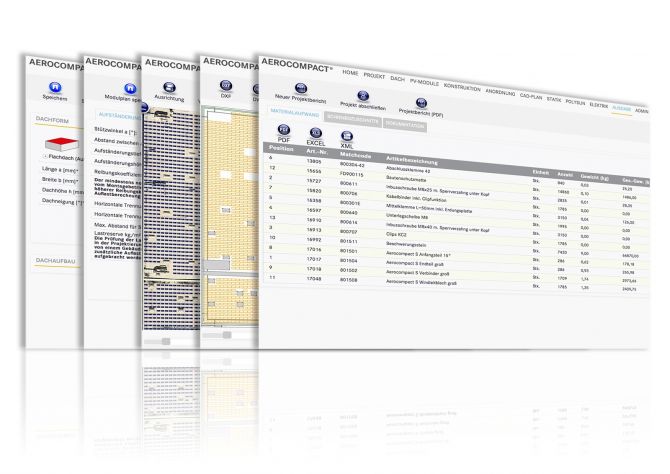 Aus der errechneten Dachbelegung erzeugt die Software eine Materialliste mit detaillierten Stücklisten, die auch nachträglich durch den Planer bearbeitet werden können. Der Leistungsumfang der Software versetzt den Anwender in die Lage, die Angebotserstellung und Planung auch ohne Begehung des Objekts durchführen und so Zeit und Personal zu sparen. Zudem kann dem Kunden bereits zum Angebot eine norm- und regelgerechte Systemstatik zusammen mit dem Ballastierungsplan vorgelegt werden. Für weitergehende Fragen zu Planungen zur Dachbelegung oder zur Angebotserstellung steht Kunden und Interessenten der Aerocompact Planungsservice zur Verfügung.