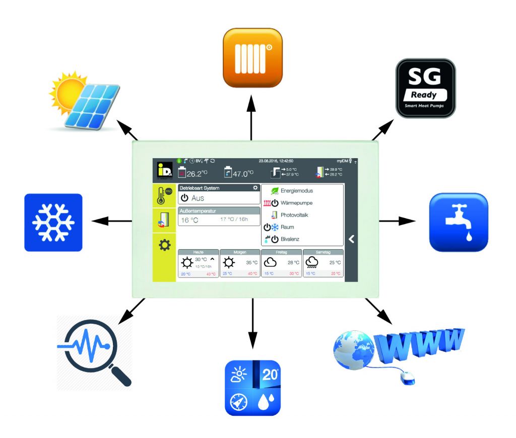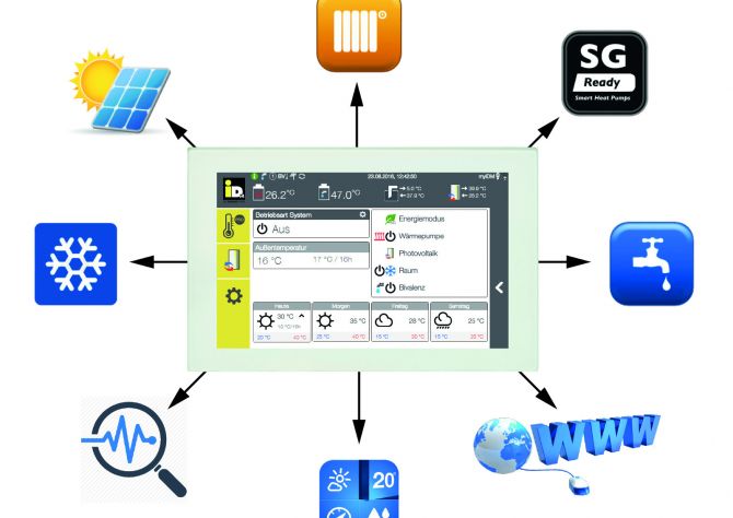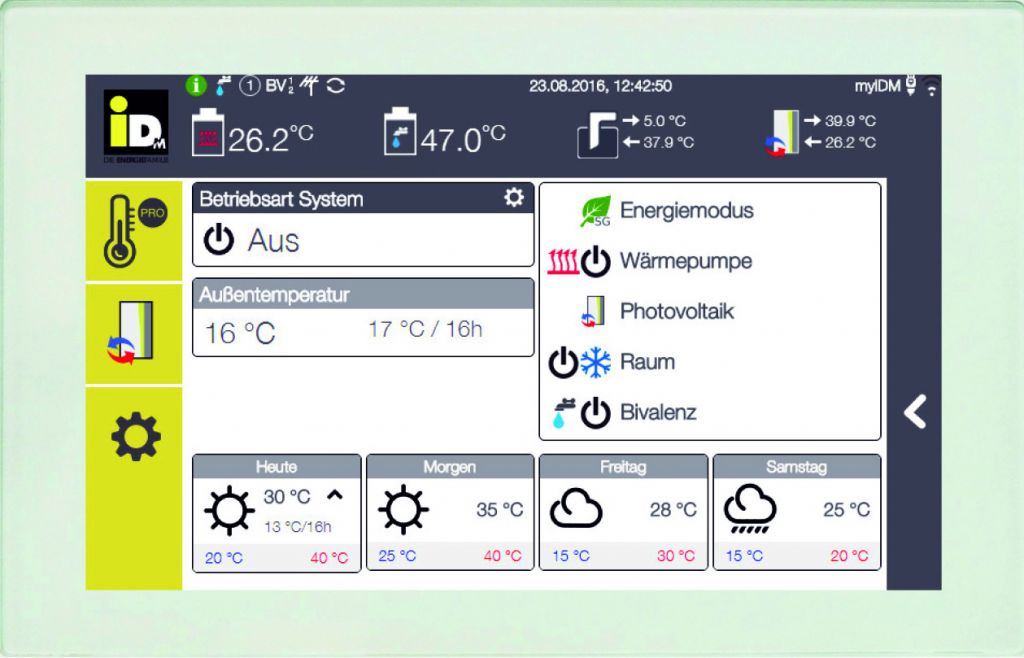 Die Navigator 2.0 Wärmepumpenregelung von iDM besitzt ein sieben Zoll großes, kapazitives Touch-Display. Eine innovative Menüführung auf dem übersichtlich gestalteten großen Display steht für einfache Bedienung mit hohem Komfort. Bis zu sechs Heizkreise lassen sich mit dem System individuell und unabhängig voneinander steuern. Die Regelung ist direkt am Display, über eine App auf dem Smartphone bzw. Tablet PC oder über BUS-Systeme und Gebäudeleittechnik steuerbar.