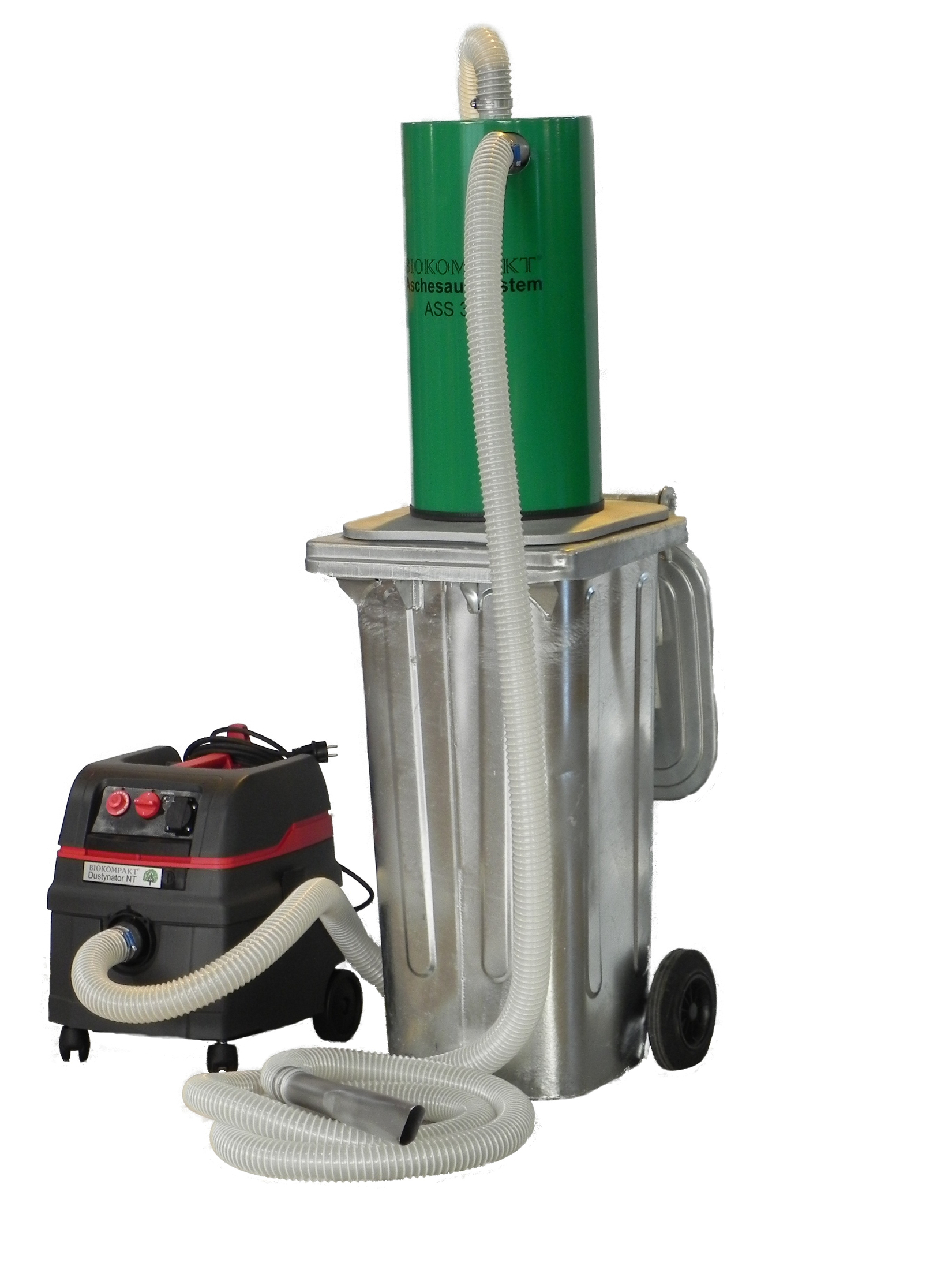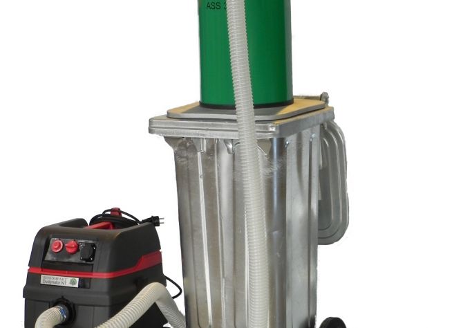 Der Aschebehälter des Absaugsystems ist mit zwei großen Transportrollen sowie einer Aufnahmevorrichtung versehen, die zu den Aufnahmen der meisten Müllfahrzeuge passt. Dadurch vereinfachen sich der Transport und die Entleerung direkt ins Müllfahrzeug. Der Behälter besteht aus stabilem feuerverzinktem Metall und hat ein Fassungsvermögen von 120 Litern. Als Staubsauger empfiehlt Biokompakt den Industriesauger Dustynator mit 1600 Watt und einer Saugleistung von 260 m3 pro Stunde, der speziell für feinen Staub geeignet ist. Einsatzfähig sind aber auch andere vorhandene Industriesauger, die allerdings nicht immer die Saugleistung und den Abscheidegrad des empfohlenen Modells erreichen.