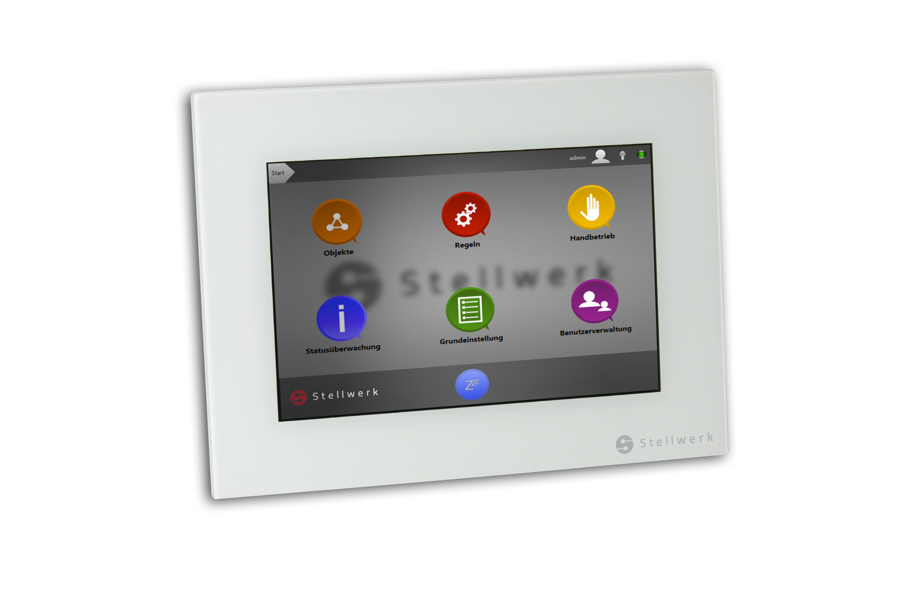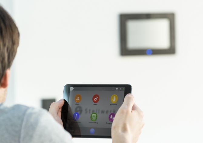 Die Stellwerk Software für die zentrale Steuerung und Regelung läuft auf einem Touch-PC, der sich an jeder gewünschten Stelle im Haus anbringen lässt. Er wird als „Schalter“, aber auch für die Programmierung und Visualisierung der Einstellungen genutzt. Zusätzlichistdie Bedienung mit einem vorhandenen PC über den standardmäßig verwendeten Internetbrowser denkbar. Über iPhone und iPad oder Android-Geräte ist die Steuerung ebenfalls möglich, zu Hause etwa über WLAN, oder von unterwegs über jeden Internetzugang.
