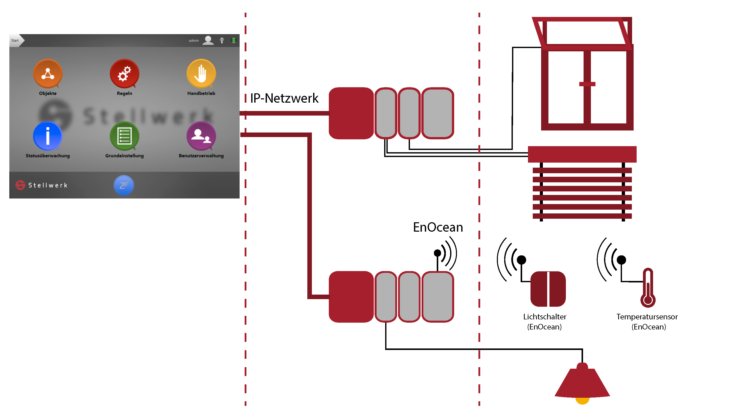 Das neu entwickelte Stellwerk Steuerungssystem für Gebäude verbindet eine hohe Nutzerfreundlichkeit mit einfacher Installation und maximaler Systemoffenheit für Steuer- und Regelkomponenten. Alle angeschlossenen Verbraucher lassen sich schnell und einfach in zeit- oder ereignisgesteuerten Regeln darstellen, die dem Nutzer den Alltag erleichtern. Stellwerk ist eine interessante Steuertechnik-Lösung für Fachhandwerker und –händler, die sich nicht an Komponenten und Systeme eines Herstellers binden möchten.