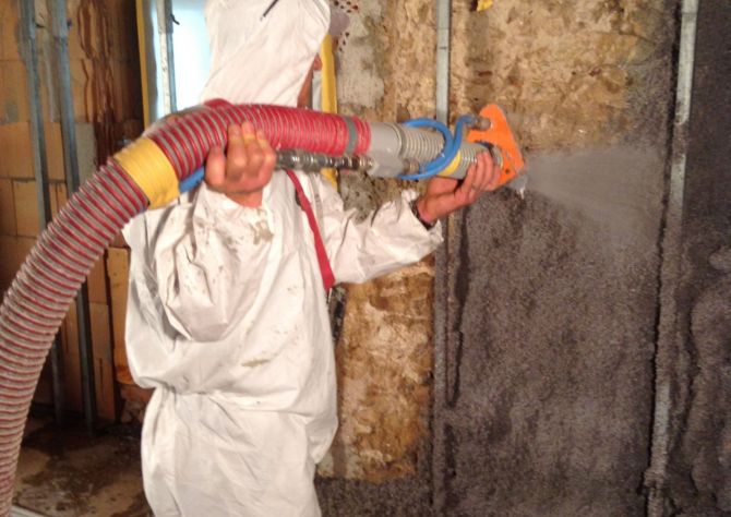 Die Cellulosedämmung wird direkt auf die Innenwand-Oberfläche aufgesprüht. Bei der Verarbeitung wird den Cellulosefasern ein geringer Kleberanteil über den separat am Sprühschlauch aufgesetzten Cellfloc Cobra Sprühkopf beigemischt. Die Schichtstärke der Cellulose bei der Verarbeitung bewegt sich im Regelfall zwischen 5 und 12 cm. Wandunebenheiten lassen sich bei der Verarbeitung gleich mit ausgleichen. Nach vollständiger Austrocknung wird die Cellulose direkt mit bauhygienischen Kalk- oder Lehmputzen verputzt.
